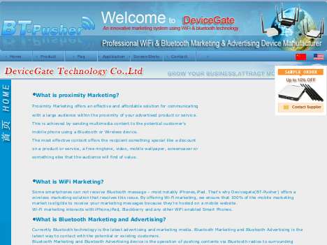 Guangzhou Devicegate Inc. is a focus on embedded software and hardware R & D company, established in 2004 .Present, we have independently developed and designed many electronic products and applications, our partners around the world. In the March 2007 we released the first Bluetooth marketing device hardware platform, in October 2007, we officially released the first Bluetooth Marketing Device product BT-Pusher, until now, we have released the full-serials Bluetooth marketing devices BT-Pusher, including BT-Pusher STANDALONE, BT-Pusher STANDARD, BT-Pusher PRO. We are the first professional manufacturer in china, the world's leading provider of Bluetooth marketing device.