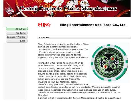 Eling Entertainment Appliance Co., Ltd, established in 1996 , is a manufacturer that specializes in development, research and technical support of casino products(including poker chips ,poker chip cases, poker tables ,dice and playing cards) and it's accessories, located in Hang Zhou City, Zhejiang Province, China.