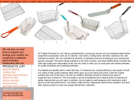 We are professional in producing various iron and stainless steel kitchen equipment accessories: fry basket, wire racks, waste bin, barbecue net, barbecue bracket, and we can manufacture all kinds of Hardware products according to your especial request. Our products have already gained a strong footing in many markets. There are many professional workers in our company. Our company has gained reputation from domestic and overseas customers with our best quality, reasonable price and best service. We are Looking forward to your very quick reply and hoping that we could start good business relationship in a near future. Will be very appreciated for your any inquiry by e-mail or telephone