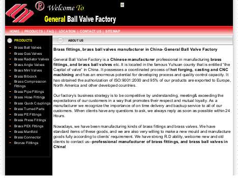 General Ball Valve Factory is a Chinese manufacturer professional in manufacturing Brass fittings, brass valves, and brass custom products etc. It is located in the famous Yuhuan county that is entitled ?the Capital of valve? in China. It possesses a coordinated process of brass forging, brass casting and brass machining and has an enormous potential for developing process and quality control capacity. It has obtained the authorization of ISO:9001:2000 and 95% of our products are exported to Europe, North America and other developed countries