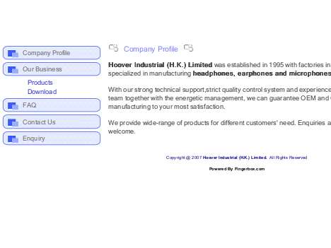 We was established in 1995 with factories in China specialized in manufacturing headphone, earphone, mini speaker and microphone for both audio & multimedia use. We are also a manufacturer of umbrella for various applications. These include folding, straight, golf, kids and children umbrella. Manufacturing of aluminium ribs & oxidizing process are all taken place in house. We provide wide-range of products for different customers' need. Enquiries are mostly welcome.