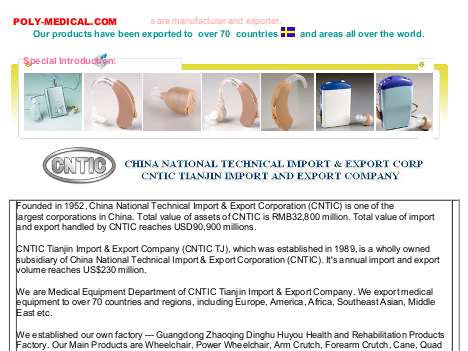 We are Poly Medical and Health Products Factory, specialized in wheelchair, electric scooter, walker, walking stick, crutch, hospital bed, hospital furniture, hearing aid, sphygmonomameter, anti-decubitus mattress, nebulizer, sterilizer, blood pressure monitor, stethoscope, thermometer, health scale, bathroom scale, etc.More details from 3w.poly-medical dot com, more information from lindalianggz at gmail dot com. Keeping the principle of HIGH QUALITY, LOW PRICE, we have exported medical eqiupments for more than 10 years.