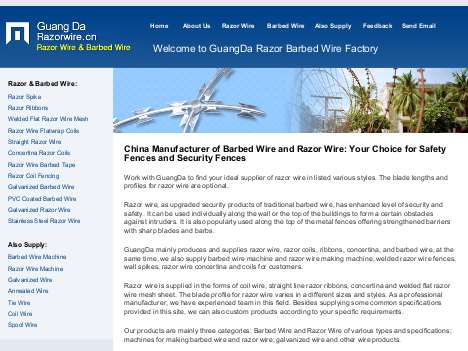 GuangDa Razor Barbed Wire Factory mainly produces and supplies razor wire and barbed wire, at the same time, we also supply barbed wire machine and razor wire making machine, galvanized wire, annealed wire, tie wire, coil wire and spool wire for customers.