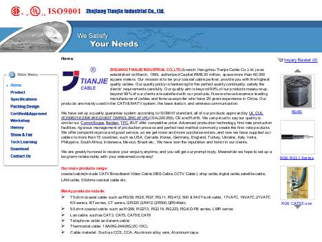 ZHEJIANG TIANJIE INDUSTRIAL CO.,LTD.(branch:hangzhou tianjie cable co.,ltd.) is established on March, 1993, authorized Capital RMB 10 million, company space more than 30,000 square meters, our mission is become your coaxial cable partner, provide you with the highest quality coaxial cable. Our quality policy is hanker for the perfect quality continually, satisfy the clients' requirements carefully. Our quality aim is beyond 99% of our products measure up,beyond 99% of our clients are satisfied with our products.Now we have became a leading manufacturer of coaxial cable and famous exporter having years experience in China. Our products are mainly used in the CATV& MATV system, the base station, wireless communication. Our mainly products include RG58,RG59U,RG6U,RG11,412,500,540,CAT5, CAT5E,5D 8D etc.