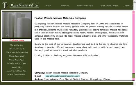 Guangdong Foshan Wonda Mosaic Materials Company, specialized in producing various Mosaic setting grids; Tile setting template ;Mosaic fiber Mesh ;mosaic paper, self-adhesive plastic film; mosaic adhesive glue ,tile nippers and other necessary tools used in the Mosaic field.